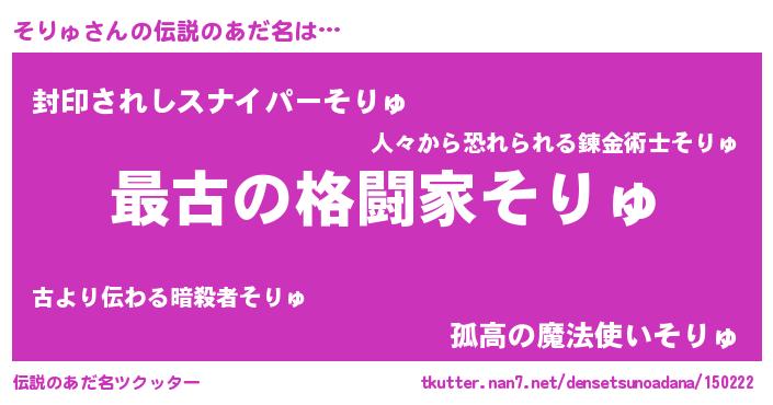 | 男性向けラノベタイトル風あだ名 | 『うちの娘の為ならば、俺はもしかしたらそりゅも倒せるかもしれない。』 |