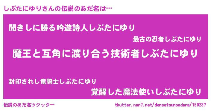 | 男性向けラノベタイトル風あだ名 | 『おまえをオタクにしてやるから、俺をしぶたにゆりにしてくれ! 』 |