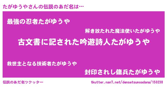| ヒーロー風カッコイイあだ名 | 『ネオタガユウヤ』『スーパータガユウヤ』 |