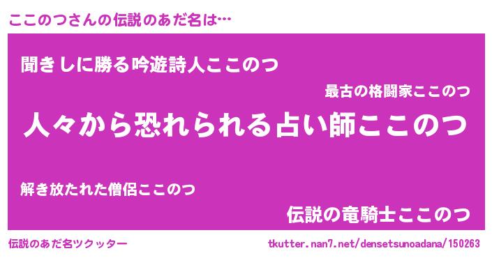 | ヒーロー風カッコイイあだ名 | 『正義の使者ここのつ』『ネオココノツ』 |