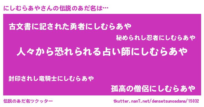 | ヘコむあだ名 | 『にしむらあや(笑)』『にしっちょ』 |