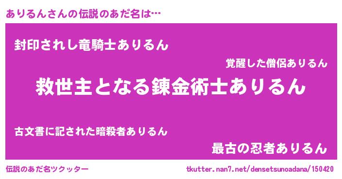 | 意味不明あだ名 | 『ヨモギ科ありるん属』『自称ありるん』 |