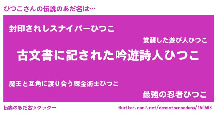 | 男性向けラノベタイトル風あだ名 | 『Re:ひつこから始める異世界生活』 |