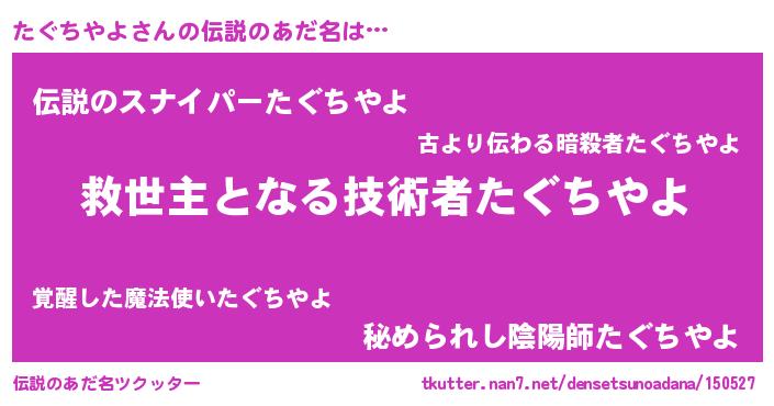 | ヒーロー風カッコイイあだ名 | 『究極戦士タグチヤヨ』『仮面タグダー』 |