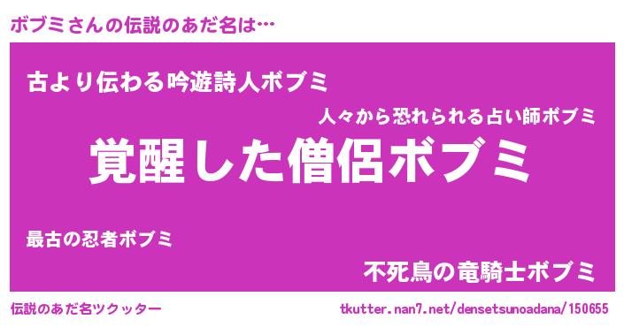 | 男性向けラノベタイトル風あだ名 | 『ボブミの嫁は女の子じゃないと思った?』 |