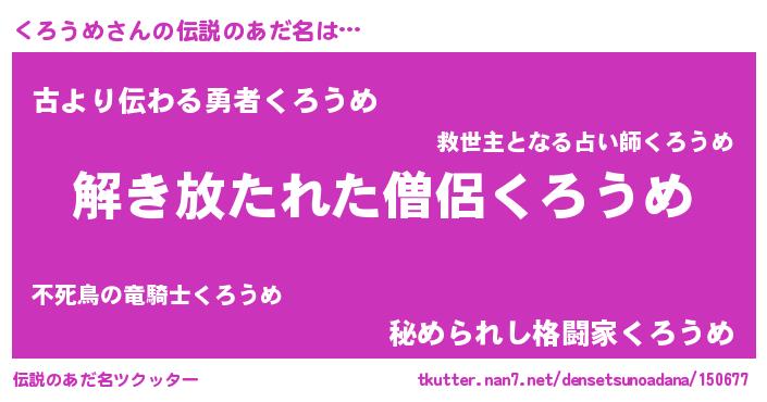 | 男性向けラノベタイトル風あだ名 | 『くろうめの嫁は女の子じゃないと思った?』 |