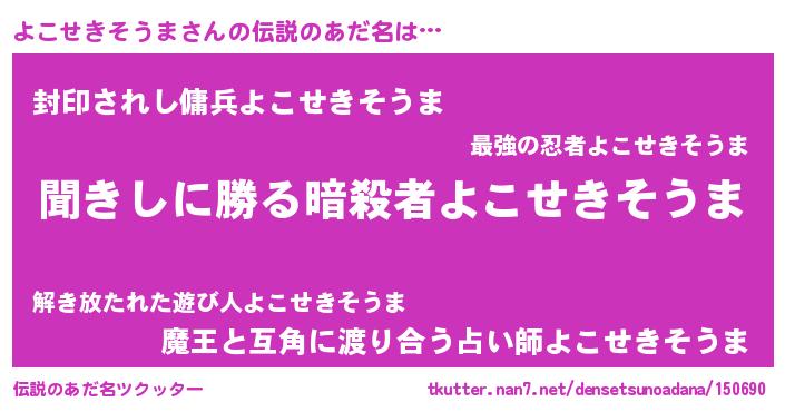 | 胡散臭い通販商品みたいなあだ名 | 『絶対に幸福をもたらす健康食品…その名も「よこせきそうま」』 |