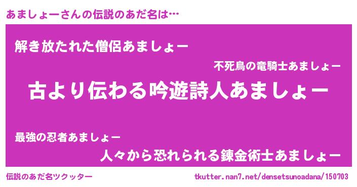 | 男性向けラノベタイトル風あだ名 | 『あましょーという概念が存在しない退屈な世界 』 |