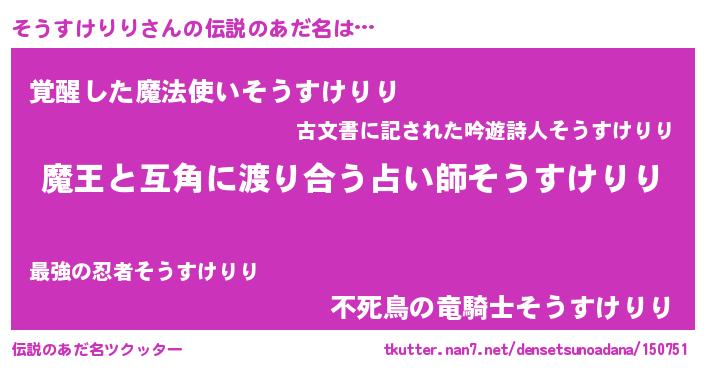 | 男性向けラノベタイトル風あだ名 | 『ノーゲーム・ノーソウスケリリ』 |