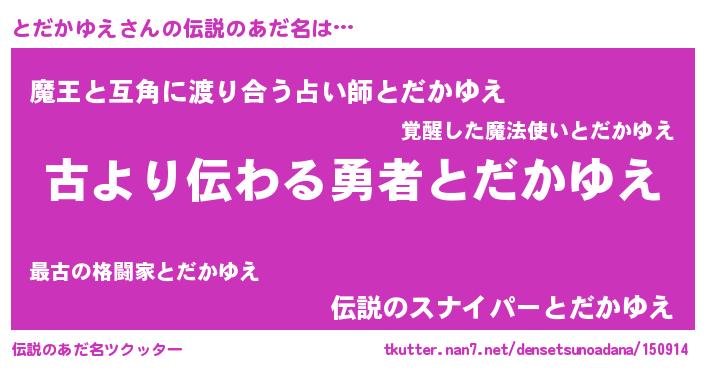 | 胡散臭い通販商品みたいなあだ名 | 『来世でも幸せになれる水素水…その名も「とだかゆえ」』 |