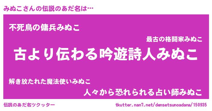| 意味不明あだ名 | 『永久保存みぬこ』『自称みぬこ』 |