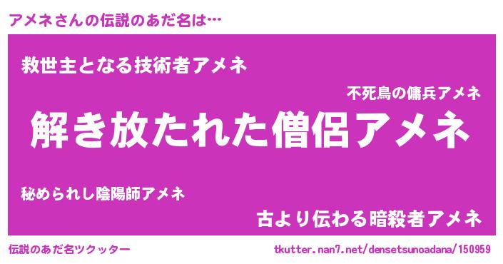 | 男性向けラノベタイトル風あだ名 | 『アメネの嫁は女の子じゃないと思った?』 |