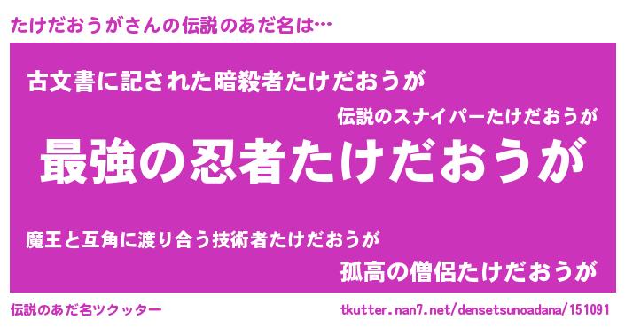 | 男性向けラノベタイトル風あだ名 | 『うちの娘の為ならば、俺はもしかしたらたけだおうがも倒せるかもしれない。』 |