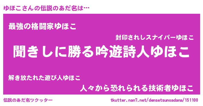 | 女子向けラノベタイトル風あだ名 | 『異世界で失敗しない100のゆほこ』 |