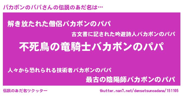 | 意味不明あだ名 | 『住所不定無職バカボンのパパ(12歳)』 |