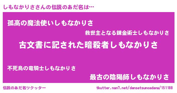| ヘコむあだ名 | 『しもなかりさ(爆)』『しもを』 |