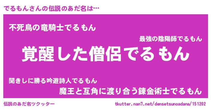 | 男性向けラノベタイトル風あだ名 | 『でるもん~年齢イコール彼女いない歴の魔法使い~』 |