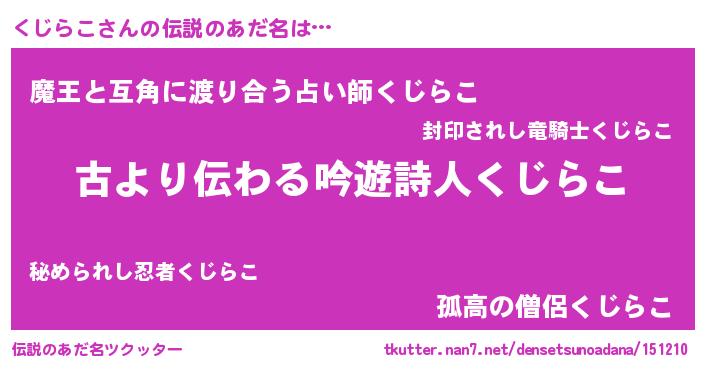 | 男性向けラノベタイトル風あだ名 | 『この素晴らしい世界にくじらこを!』 |