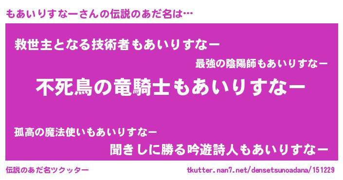 | 胡散臭い通販商品みたいなあだ名 | 『世界中を虜にした100年もののヴィンテージワイン…その名も「もあいりすなー」』 |