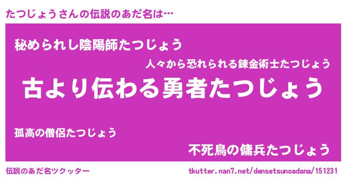 | 胡散臭い通販商品みたいなあだ名 | 『来世でも幸せになれる水素水…その名も「たつじょう」』 |