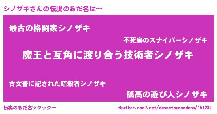 | ヒーロー風カッコイイあだ名 | 『愛の使者シノザキ』『魔戒騎士シノ』 |