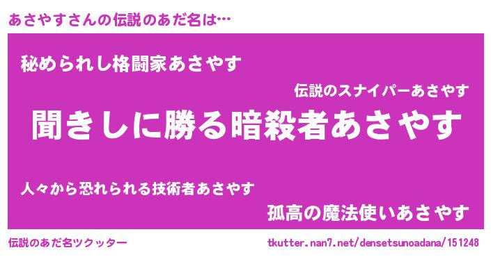 | 男性向けラノベタイトル風あだ名 | 『あさやすという概念が存在しない退屈な世界 』 |