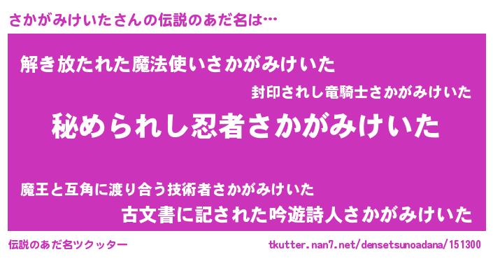 | 意味不明あだ名 | 『住所不定無職さかがみけいた(14歳)』 |