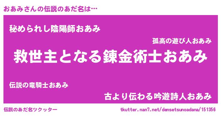 | ヒーロー風カッコイイあだ名 | 『天空の使者おあみ』『超時空戦士オアミ』 |