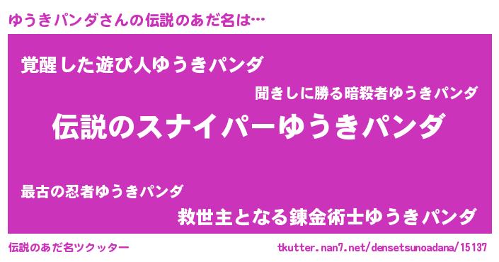 | 男性向けラノベタイトル風あだ名 | 『ユウキパンダスレイヤー』 |