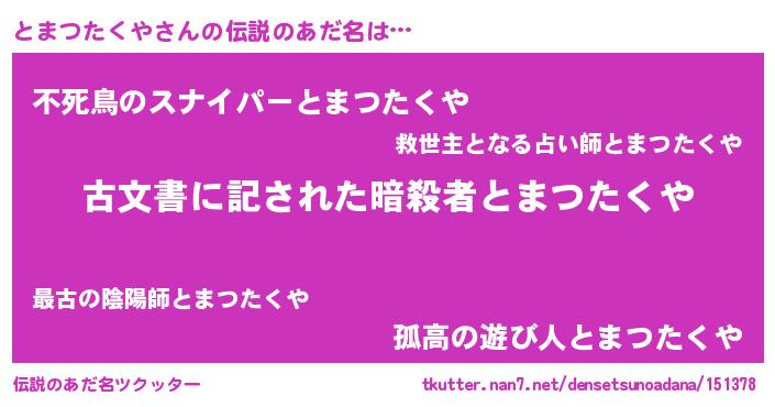 | 男性向けラノベタイトル風あだ名 | 『とまつたくや~年齢イコール彼女いない歴の魔法使い~』 |