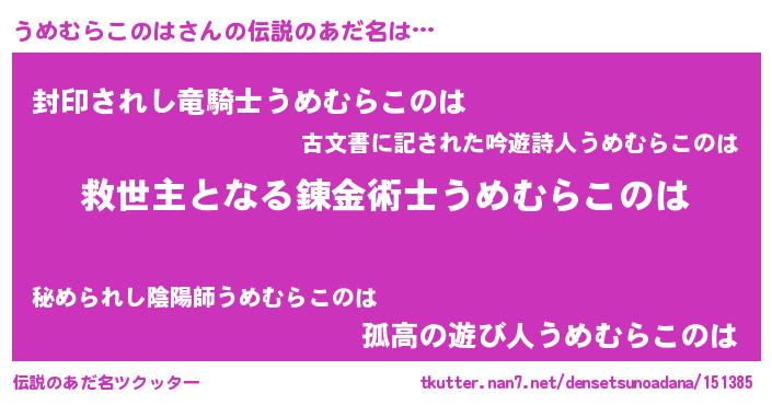 | 男性向けラノベタイトル風あだ名 | 『この素晴らしい世界にうめむらこのはを!』 |