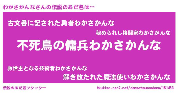 | 男性向けラノベタイトル風あだ名 | 『わかさかんなに滅ぼされるだけの簡単なお仕事です』 |