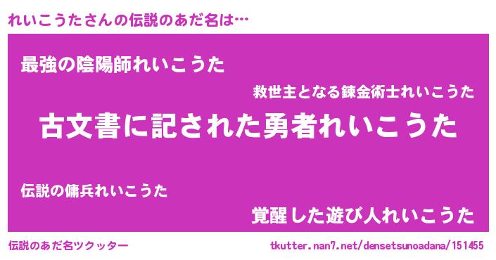 | 男性向けラノベタイトル風あだ名 | 『れいこうた~年齢イコール彼女いない歴の魔法使い~』 |