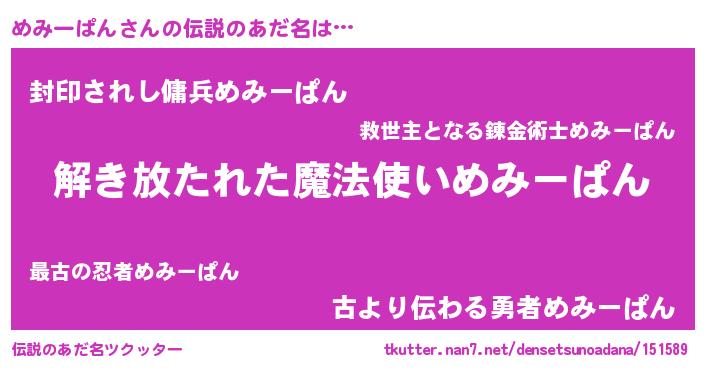 | 男性向けラノベタイトル風あだ名 | 『ダンジョンにめみーぱんを求めるのは間違っているだろうか』 |