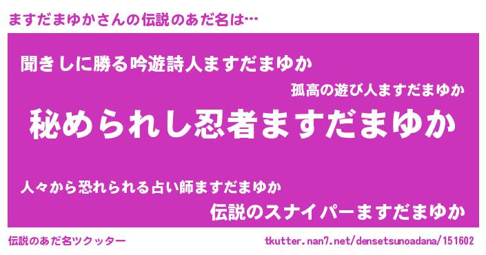 | 男性向けラノベタイトル風あだ名 | 『マスダマユカスレイヤー』 |