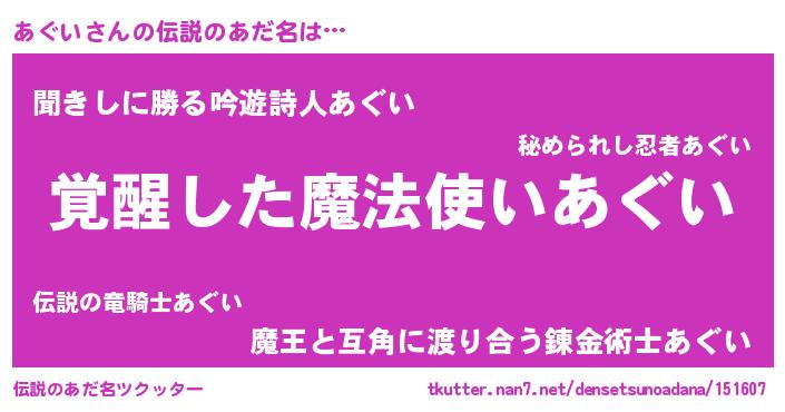 | 意味不明あだ名 | 『とにかく怪しいあぐい』『自称あぐい』 |