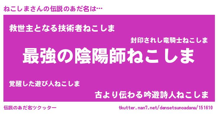 | 男性向けラノベタイトル風あだ名 | 『うちのねこしまが世界を掌握している!』 |