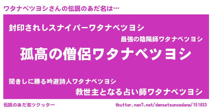 | ポケモン風あだ名 | 『ワータイ』『ヒワタナベツヨシ』 |