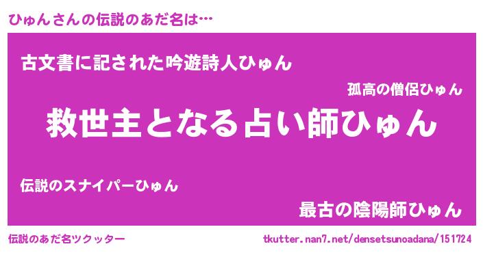 | ヒーロー風カッコイイあだ名 | 『慈愛の使者ひゅん』『究極戦士ヒュン』 |