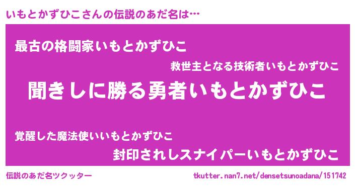 | 男性向けラノベタイトル風あだ名 | 『いもとかずひこという概念が存在しない退屈な世界 』 |