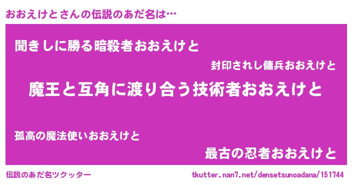 | 意味不明あだ名 | 『自称おおえけと』『永久保存おおえけと』 |