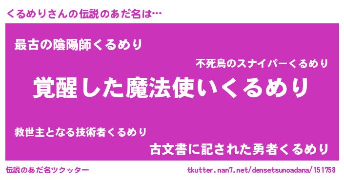 | ヒーロー風カッコイイあだ名 | 『天弓騎士クル』『ウルトラくるめりマン』 |