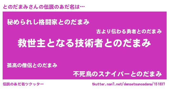 | 肩書あだ名 | 『とのだまみ教授』『とのだまみ総理大臣』 |