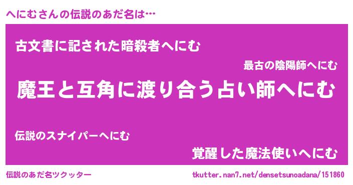 | 男性向けラノベタイトル風あだ名 | 『ノーゲーム・ノーヘニム』 |