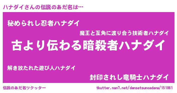 | ヒーロー風カッコイイあだ名 | 『ネオハナダイ』『ウルトラハナダイマン』 |