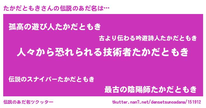 | 肩書あだ名 | 『たかだともき教授』『たかだともき少佐』 |