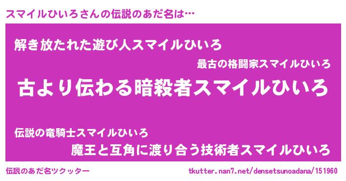 | ヒーロー風カッコイイあだ名 | 『ネオスマイルヒイロ』『銀牙騎士スマ』 |