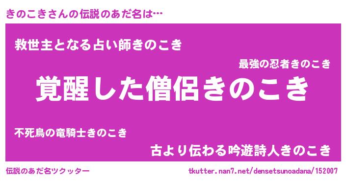 | ヒーロー風カッコイイあだ名 | 『幻影騎士キノ』『最強戦士キノコキ』 |