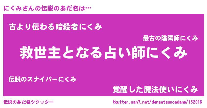 | 女子向けラノベタイトル風あだ名 | 『死神にくみの再婚』『闇のにくみ』 |