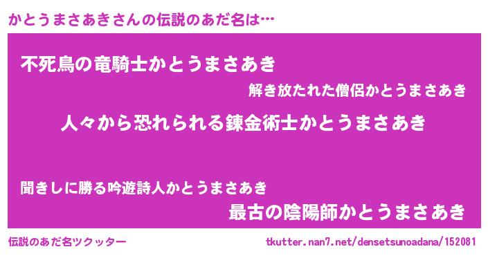 | 男性向けラノベタイトル風あだ名 | 『おまえをオタクにしてやるから、俺をかとうまさあきにしてくれ! 』 |
